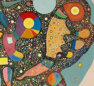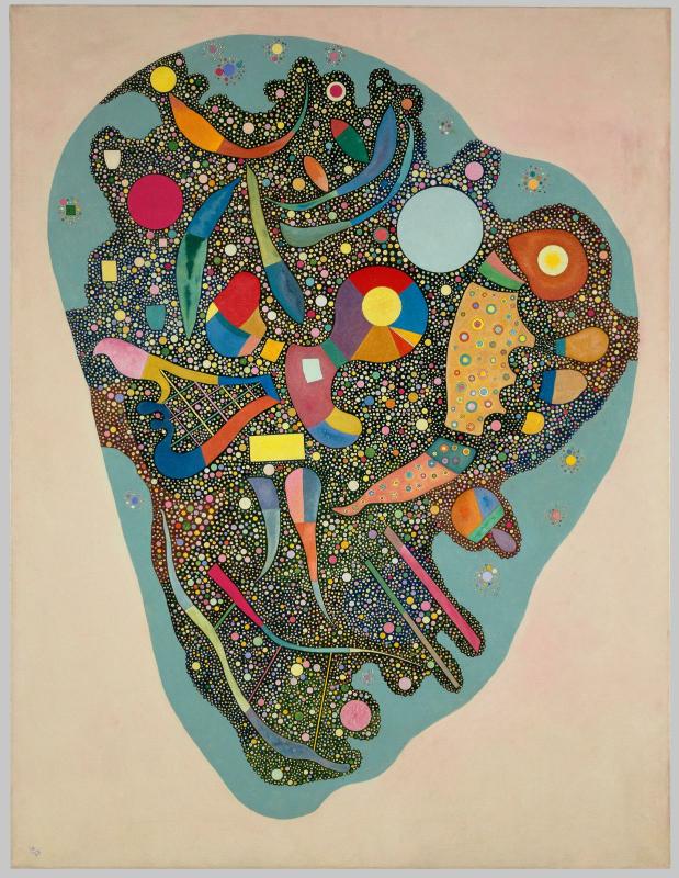 Pourquoi Entassement réglé, me demanderiez-vous ? C’est vrai, je suis moi-même bien incapable de nommer le tableau de Kandinsky que je préfère. Alors, j’ai fait comme Kandinsky aurait fait : stopper la raison pour écouter l’envie première, sans y revenir ni en chercher la cause. Je ne sais par quoi commencer : formes ou couleurs ? Elles sont ici tellement indissociables que je vais tenter de faire les deux, sans vous assommer cependant. Sur un fond couleur sable clair, l’œil perçoit une première forme bleu azur légèrement verdie, ressemblant vaguement à un cœur organique. On y trouve quelques premiers cercles discrets, épars, chacun entouré de son cortège de minuscules cercles. Mais cette première forme est presque masquée par le cœur véritable du tableau dans lequel le regard ne peut que plonger : une grande tache d’encre noire, constellée de centaines de points, indénombrables, colorés mais plutôt clairs, pastels, qui remplissent chaque espace de néant, empêchant au noir profond, total, puissant d’étendre son effet. Il reste là, on ne peut l’ignorer, mais il est dominé par l’effervescence des couleurs qui semblent se multiplier. Au milieu de ces points plus ou moins petits, se détachent des formes, typiques de Kandinsky, reconnaissables entre toutes. Mis à part quelques formes rectangulaires vers le bas, le trait est quasi absent. Ce sont des formes courbes, biscornues, irrégulières et imprévisibles. Les plus petites contiennent deux couleurs, les autres en cumulent plus.