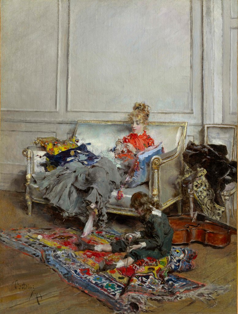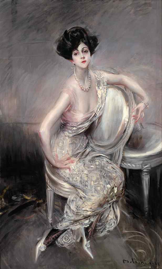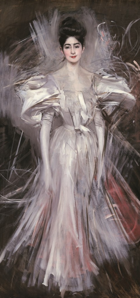 Nous avons parlé du mouvement, de la foule que vous trouverez dans les productions de Boldini au Petit Palais, mais vous pourrez aussi vous arrêter devant les portraits du maitre italien pour plonger vos yeux dans ceux des plus beaux et belles mondaines de l’époque. Les parisiennes dans toute leur splendeur s’alanguissent sous son pinceau. On ne peut s’empêcher de penser aux personnages habitant les romans de cet entre deux siècles qui semblent incarnés par le peintre, notamment ceux de Proust… Il nous offre une ode à l’élégance à la française, capturant l’essence de cette société du début du siècle, avec son regard observateur pénétrant aussi bien l’entièreté d’une rue que l’intimité d’un regard.