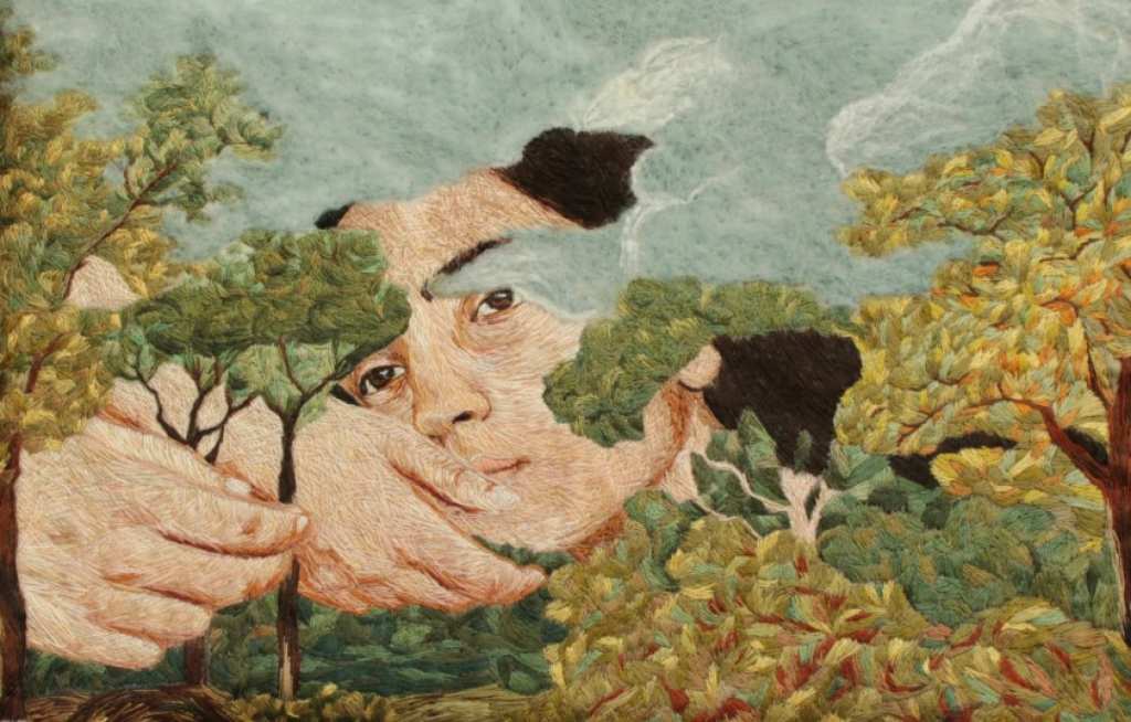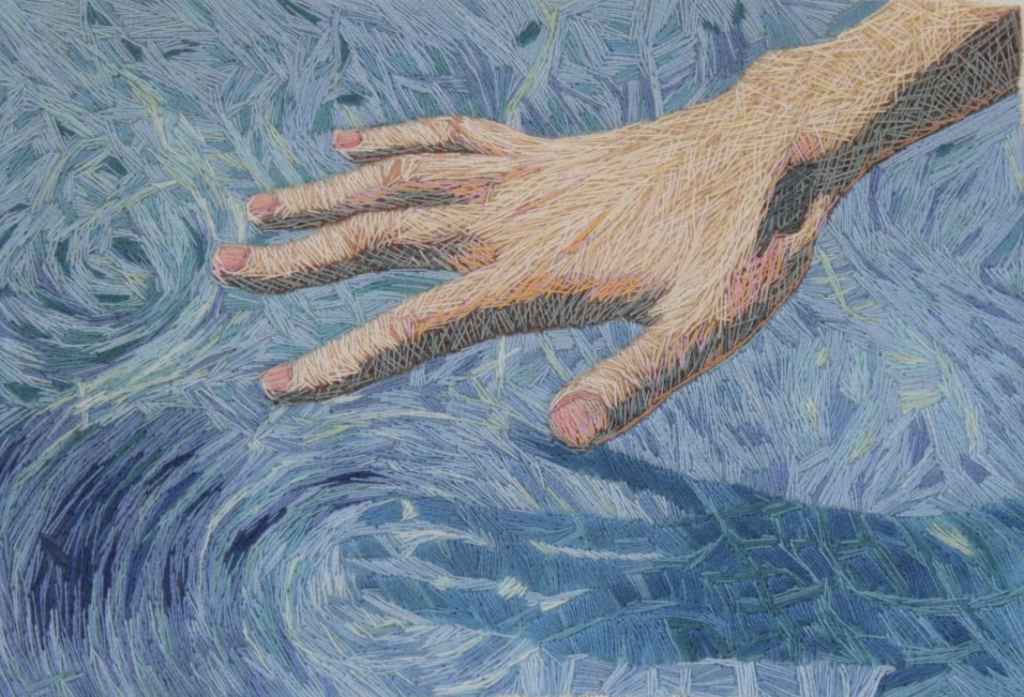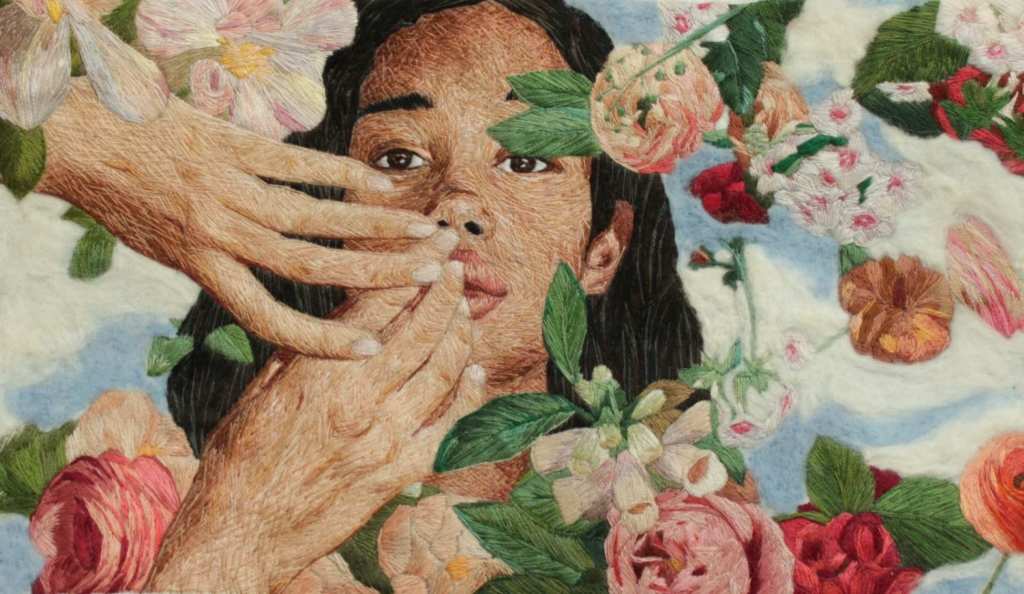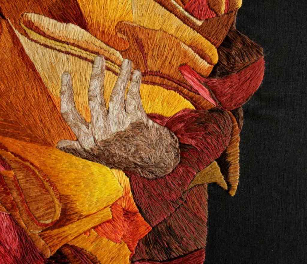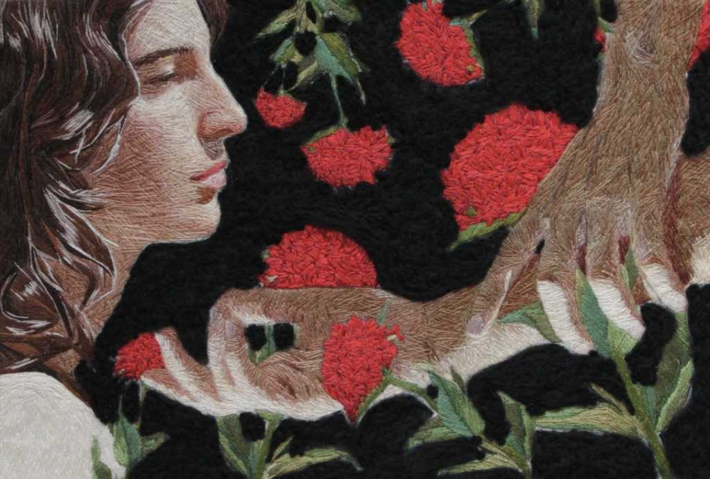 L’artiste française a toujours voulu raconter des histoires. Influencée par le théâtre et ayant longtemps travaillé pour le cinéma, c’est à la mort de sa mère qu’elle ressent le besoin de s’exposer à de nouveaux médiums de création, plus sensitifs. Elle troque alors la camera contre les aiguilles, dont la dimension très tactile de cet art est au centre de sa création : ses récits se construisent désormais grâce à l’entrecroisement des fils multicolores. Contrairement au pinceau, la broderie est un art de la lenteur, dont le processus de répétition gestuelle est central pour la brodeuse. La broderie ouvre de nouvelles possibilités de texture, s’échappant de quelques millimètres de son canevas par l’amoncellement des fils dont nos yeux suivent le chemin.