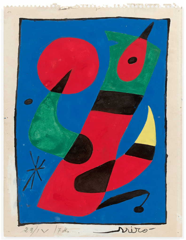 Cette œuvre passée sous le marteau est exceptionnelle par sa qualité, largement connue du grand public puisque fruit de la toute première commande de La Poste à un artiste et donc diffusée à plus de 6 millions d’exemplaires entre 1974 et 1975. Un Oiseau Bleu resplendissant, gouache originale d’un timbre mondialement connu et commandée à Miró par le ministre des Postes en 1974, signé par l’illustre artiste.