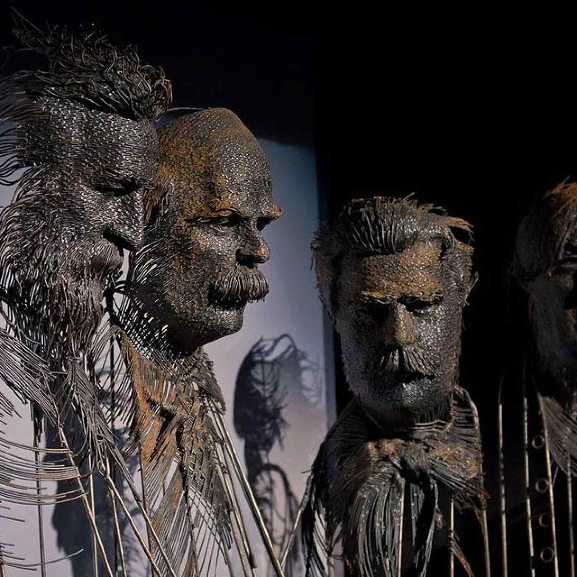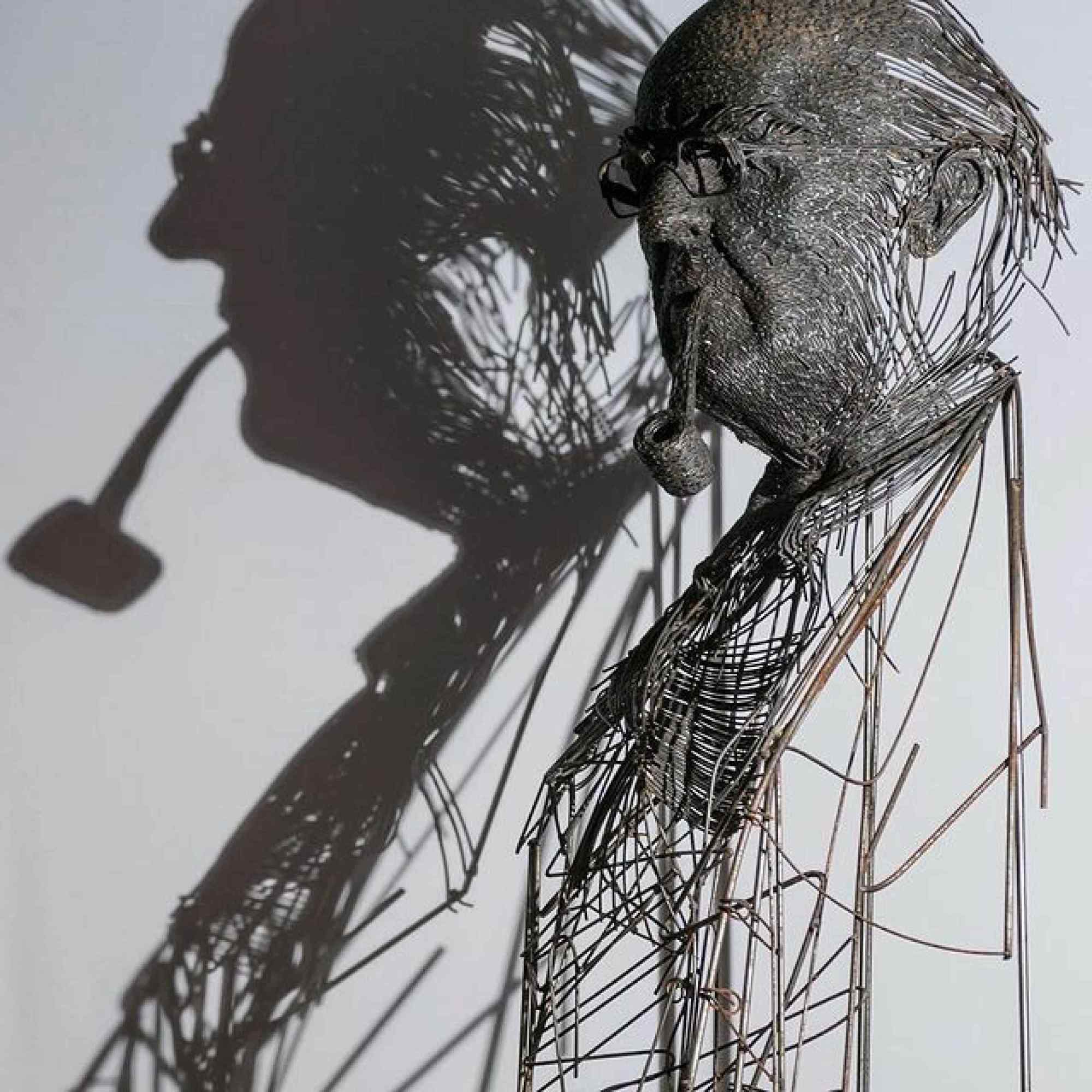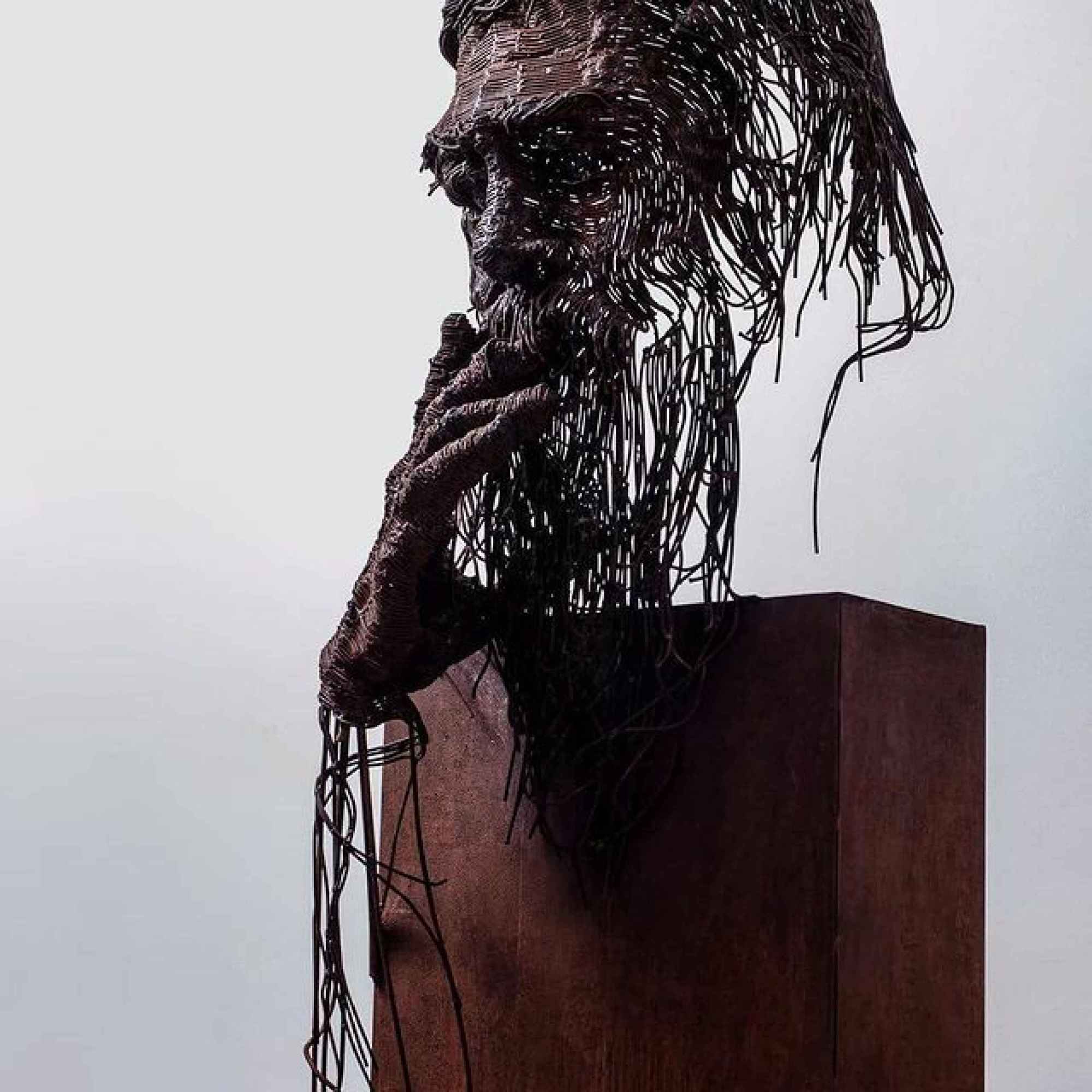 Car ceux que l’artiste né en Transylvanie sculpte ne sont pas choisis au hasard : il dresse principalement le portrait d’écrivains, de philosophes, de musiciens roumains. Il s’inscrit pleinement dans la tradition des bustes classiques en hommage aux grands hommes. C’est sur le point de la technique qu’il diffère : ses portraits n’imposent pas le poids immuable et figé de la matière. L’accumulation de multiples fils en acier, en laiton ou cuivre, dont le mélange produit des effets d’ombres et de contrastes, donne une impression de mouvement, de fluidité, comme des coups de crayon rapidement griffonnés qui laissent la lumière passer. Cet effet est amplifié par l’absence de finitude de ses sculptures. Celles-ci ne sont pas fermées sur elles-mêmes, les fils métalliques sont coupés de manière ostensible, là où la soudure ne les a pas fixés, mélangés les uns aux autres, comme échappés. Cela produit une idée de prolongement et de mouvement, comme si les bustes étaient d’étranges apparitions fantomatiques matérielles et industrielles. Darius Hulea nous offre un regard sur l’intériorité des personnes représentées, un aperçu produit par ses sculptures toujours inabouties, en suspens.