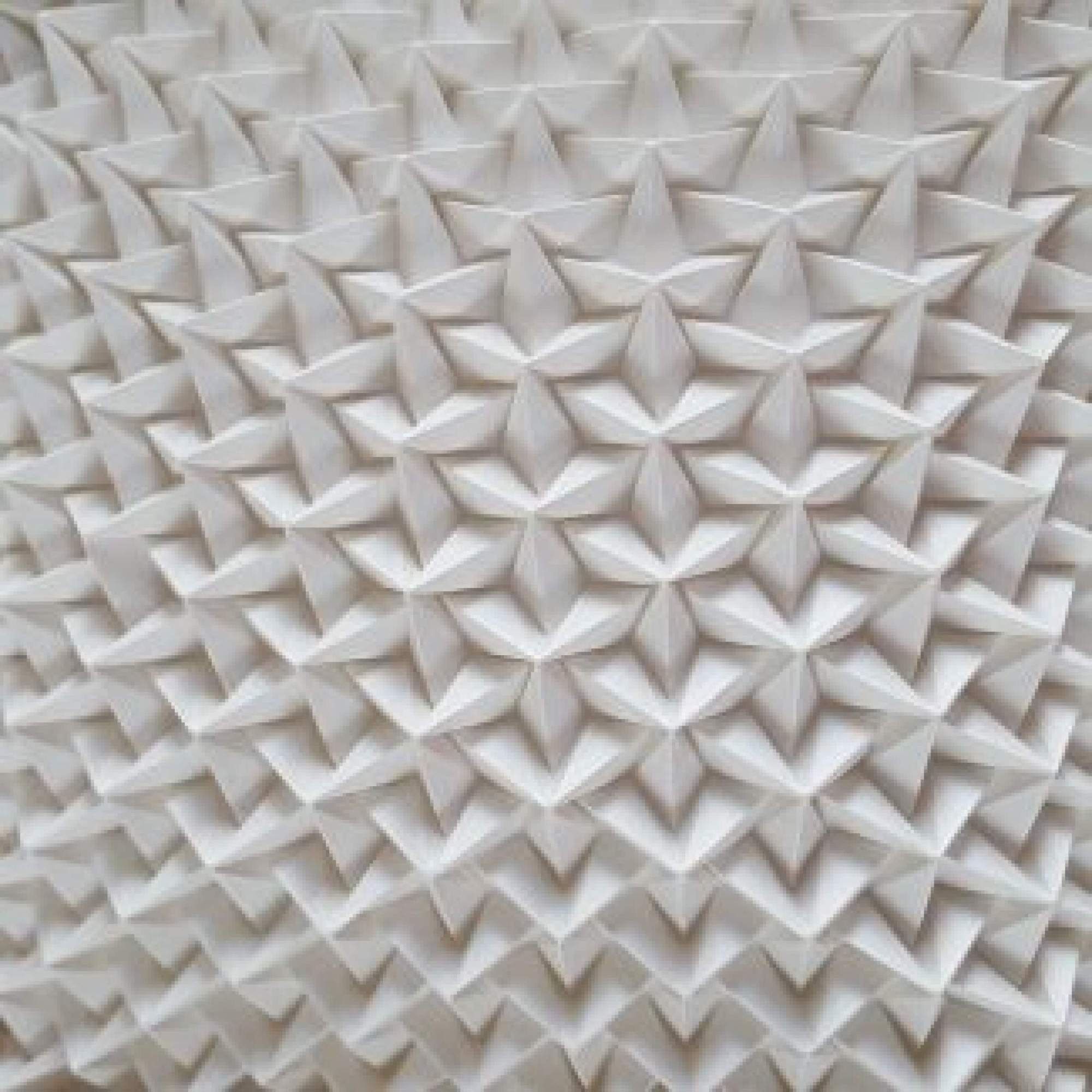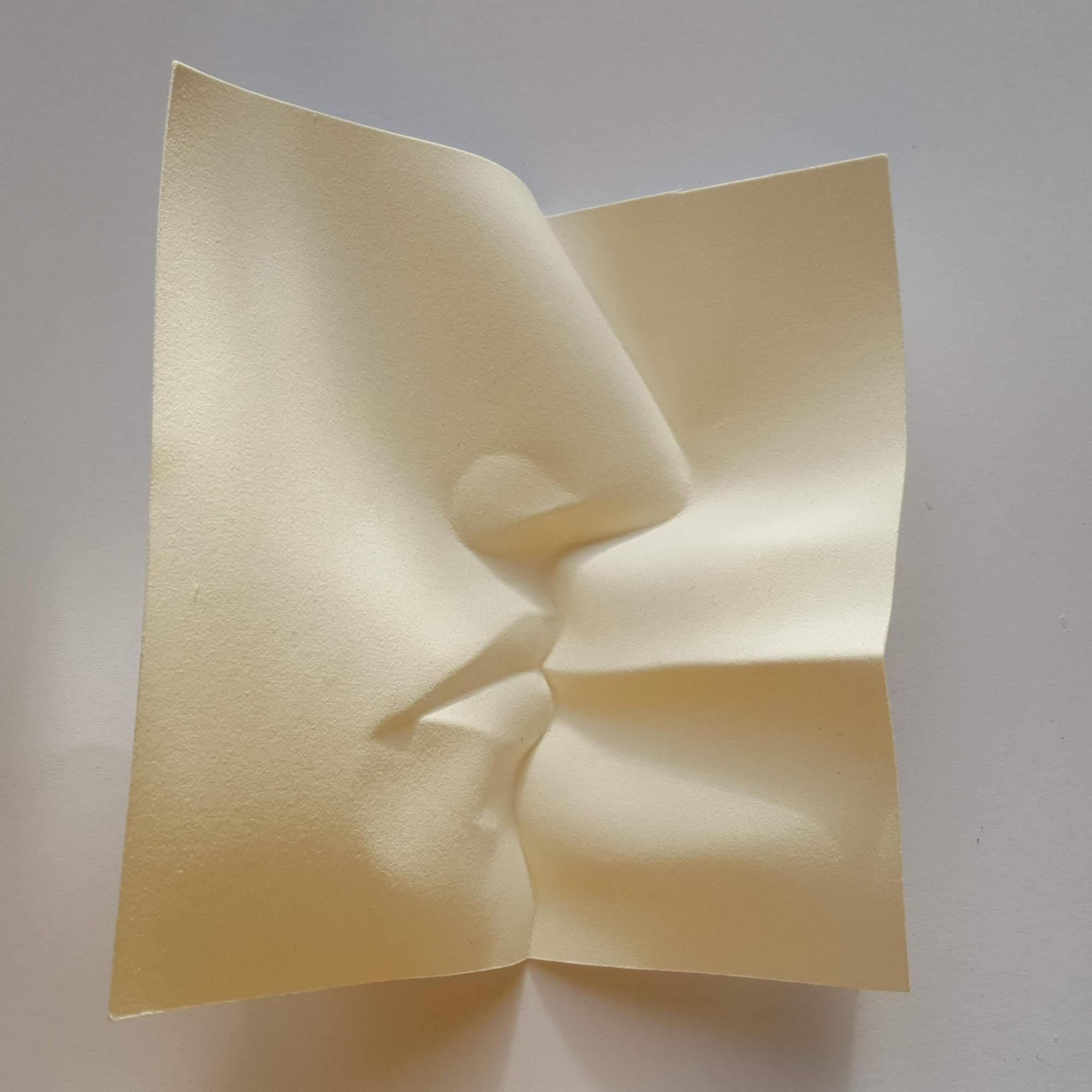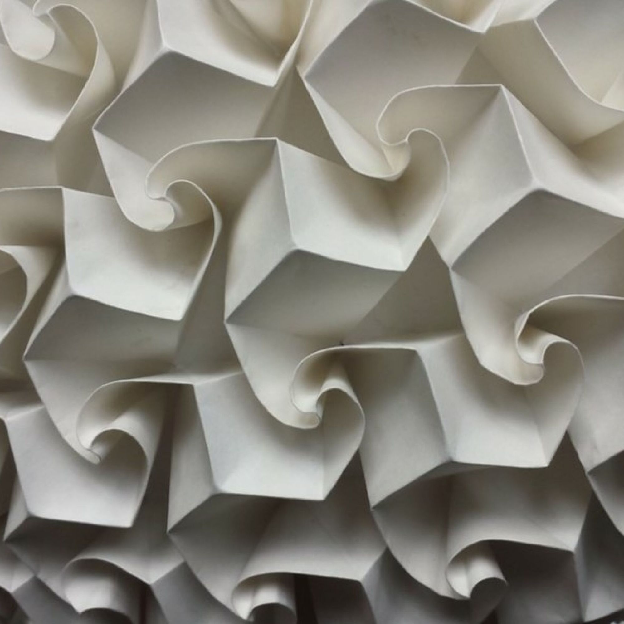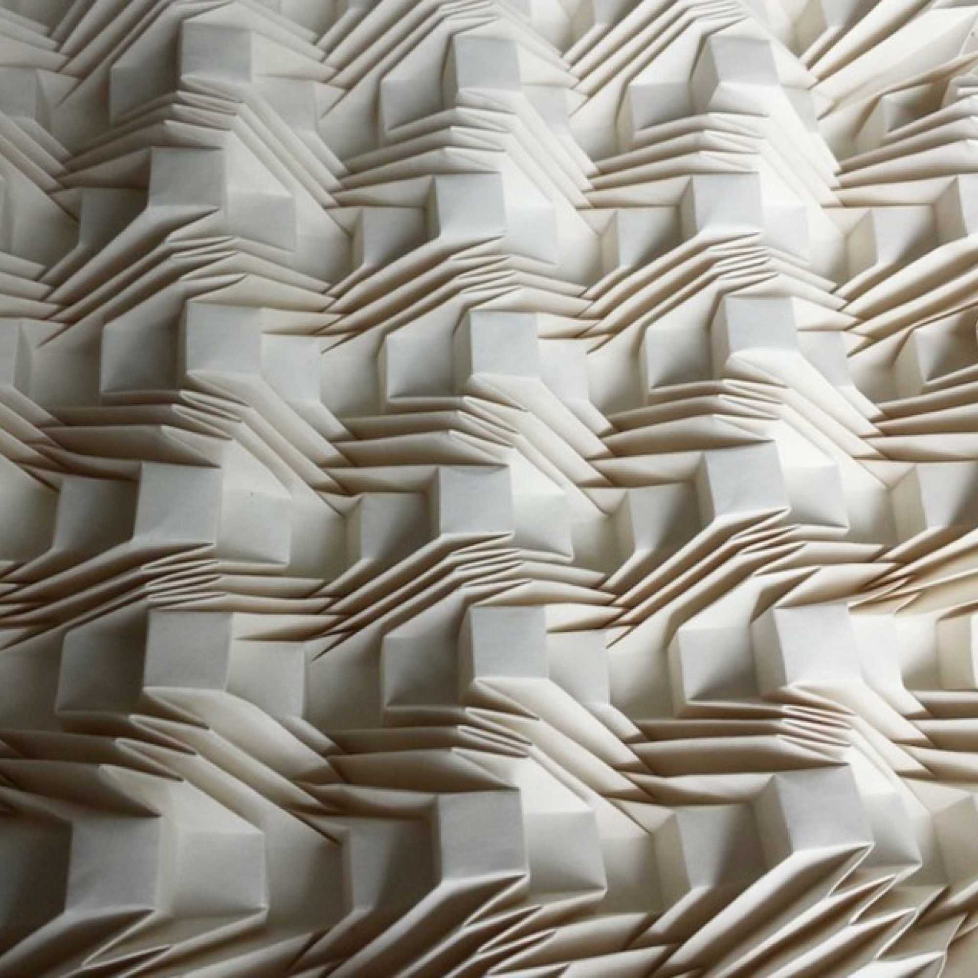 Ses travaux suivent les règles classiques de l’origami : pas de découpage, pas de colle, rien que des plis. Le résultat, une série follement sensuelle où elle sculpte obsessionnellement des bouches, qui semblent apparaître comme par hasard au milieu du papier froissé. Une autre de ses séries est particulièrement impressionnante : beaucoup plus géométrique, elle répète le même motif des dizaines, des centaines de fois, créant des modèles décoratifs qui peuvent se transformer en s’étendant, comme un accordéon.