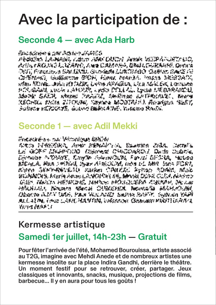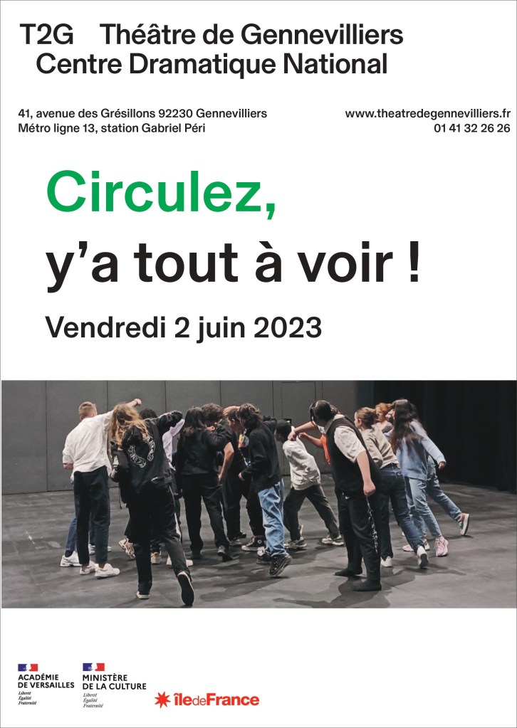 Exemple d’un document print réalisé pour le T2G Théâtre de Gennevilliers – Centre Dramatique National à l’occasion d’une journée de restitution de projets lycéens encadrés par des comédiens professionnels, dans le cadre du CREAC (Convention Régionale pour l’Education Artistique et Culturelle).