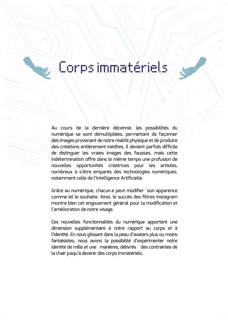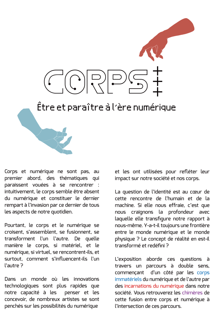 Chaque année, les étudiants du master 2 MTI réalisent une exposition de A à Z, du commissariat de l’exposition au vernissage en passant par la conception des produits graphiques, la rédaction du contenu, la communication, la scénographie… Ma promotion a eu l’occasion de travailler sur les thèmes du corps et du numérique et la manière dont ils interagissent dans la société d’aujourd’hui.