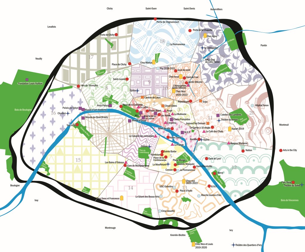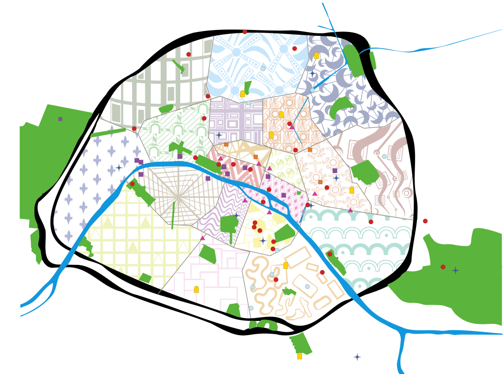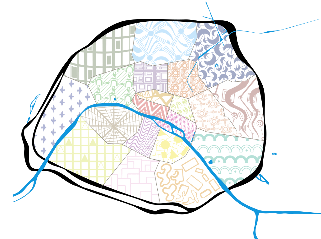 Cartes, plans : ces objets graphiques m’ont toujours fascinés, par leur rigueur technique associée à ce qu’ils figurent imaginairement. C’est donc tout naturellement que je travaille ces objets avec ma vision artistique, comme avec cette carte de Paris pointant les endroits qui sont importants personnellement depuis que j’y vis. L’ambiance, le goût que chaque arrondissement a pour moi sont rendus par des motifs monochromes.